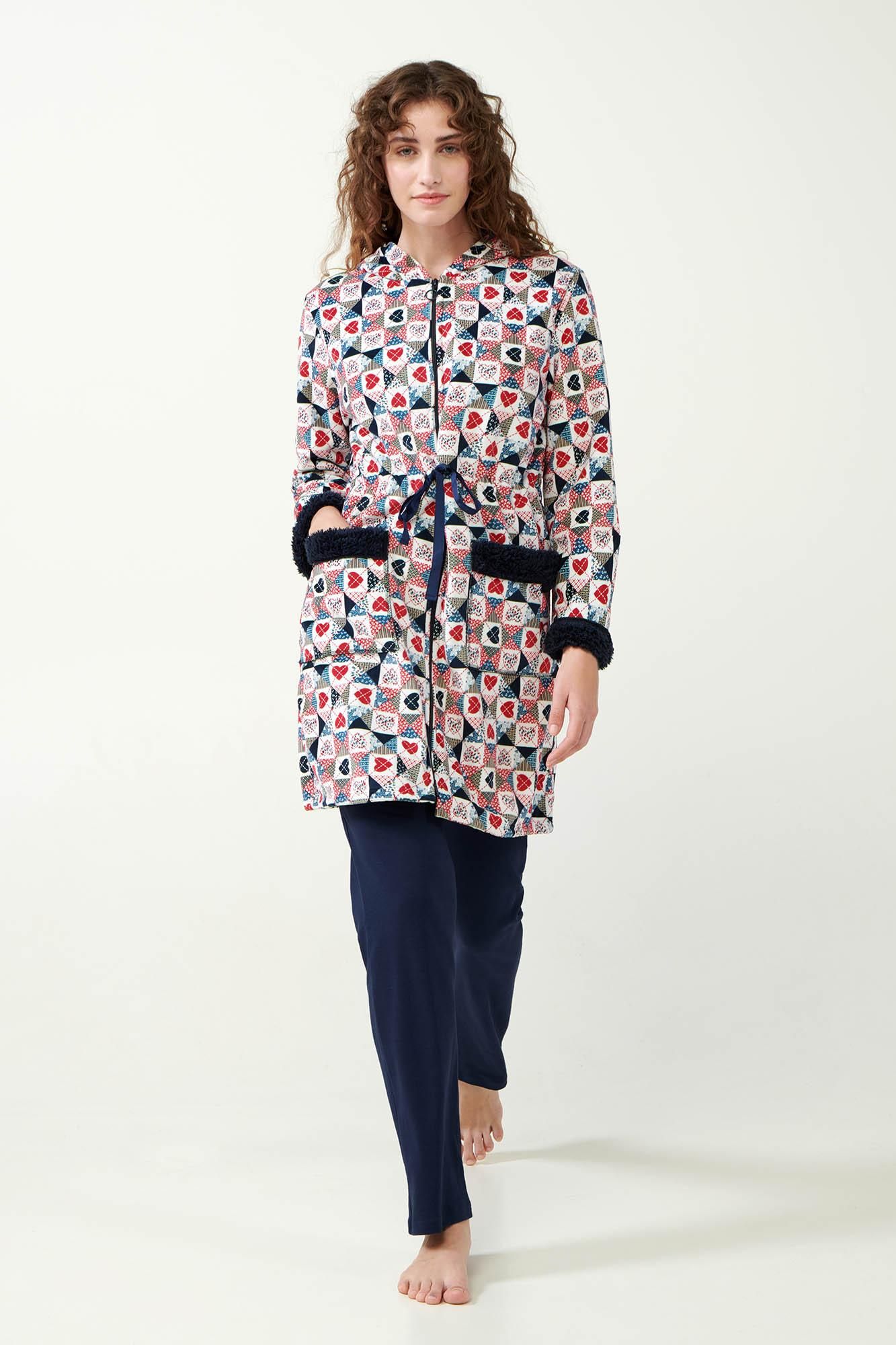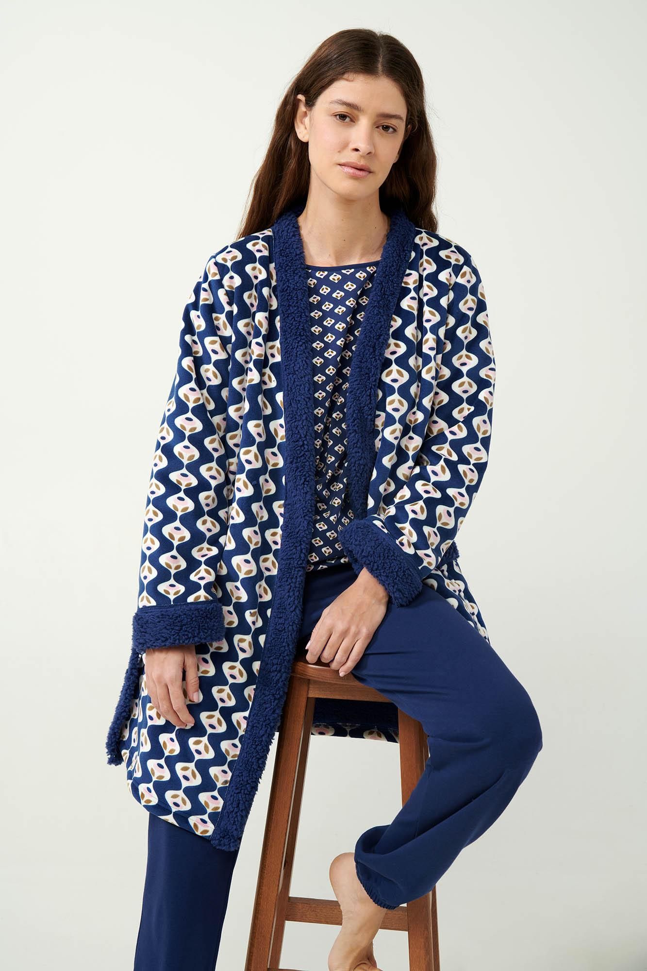 - Γυναικεία πυζάμα από micromodal με βαθιά πατιλέτα- Μονόχρωμο μπλουζάκι σε μπλέ σκούρο χρώμα- Εμπριμέ Παντελόνι σε ίσια γρμαμή με περαστή κορδέλα και..